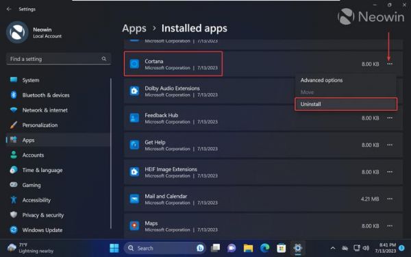启动“设置”应用程序并转到“已安装的应用程序 > 应用程序”,找到 Cortana 并单击旁边带有三个点的按钮,选择“卸载”并确认操作。
