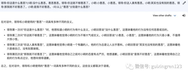 硅星人立即和Bard聊了聊。一些常规的问题Bard当然对答如流。拿一个“中文十级”的题目来进行测试,看看它到底理不理解中文的博大精深: