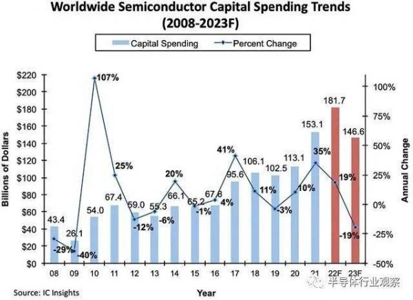 近日,据IC Insights数据显示,继2021年半导体资本支出增长35%,2022年增长19%以后,预测2023年半导体资本支出将下降14%。