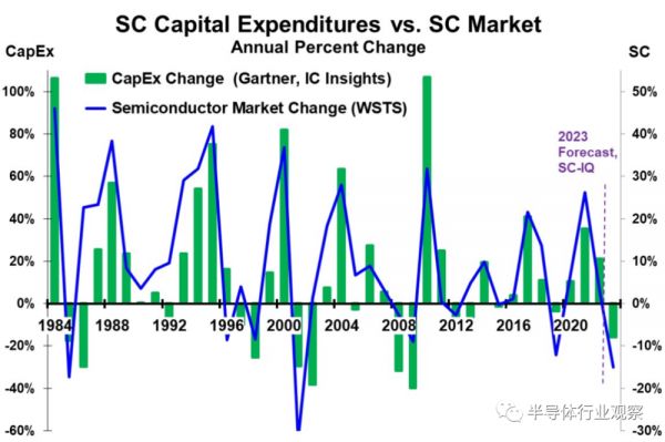 因此,面对2023年这个半导体市场的又一个重大低迷年,行业资本支出相对于市场会再次随之开始下降。