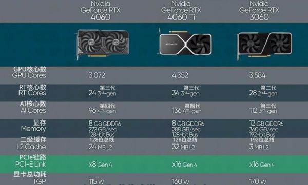图源:LTT当然,我知道RTX 4060换了新的核心架构,但是流处理器数量的差异,即使有着更高效的核心架构也难以直接抹平两者的差距,甚至RTX 4060的PCIe带宽都被砍了一半,RTX 3060尚且支持x16 Gen4,RTX 4060则只支持x8 Gen4,显存从12GB变成了8GB,显存带宽也被从192bit砍到了128bit。