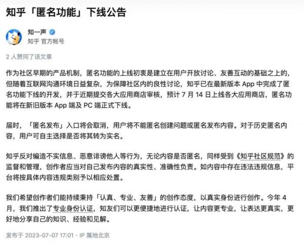 近日,知乎发布公告表示,新版本预计7月14日上线各大应用商店,匿名功能将在新旧版本app端及pc端正式下线。届时,“匿名发布”入口将会取消,用户将不能匿名创建问题或匿名发布内容。