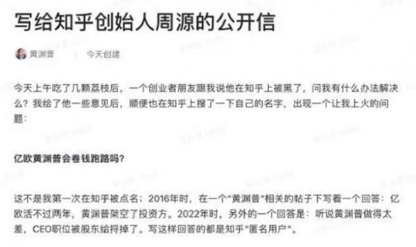 ▲黄渊普所写的《写给知乎创始人周源的公开信》(图/网络)