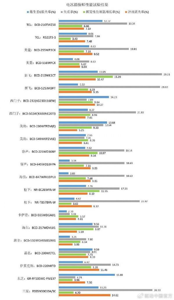 保鲜性能可以说是考验电冰箱的基本功,而在此次采购的22款电冰箱样品中,所有产品都在说明书或者是网页宣传处打上了保鲜、养鲜的标签,对此,中国家用电器研究院(北京)检测认证有限公司依据QB/T 5510-2021《家用电冰箱保鲜性能试验方法》进行了保鲜性能测试,测试了维生素C损失率(果蔬)以及汁液流失率(肉类)等4项指标。