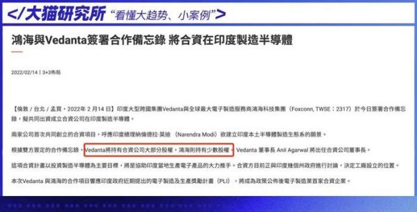 有一个值得关注的细节,虽然双方合资,但是主导其实是Vedanta,富士康方面只有少部分股权,而且,在双方的合作中,富士康主打技术,Vedanta主打融资,也就是说,富士康的出资额,可能没有达到印度方面的预期。