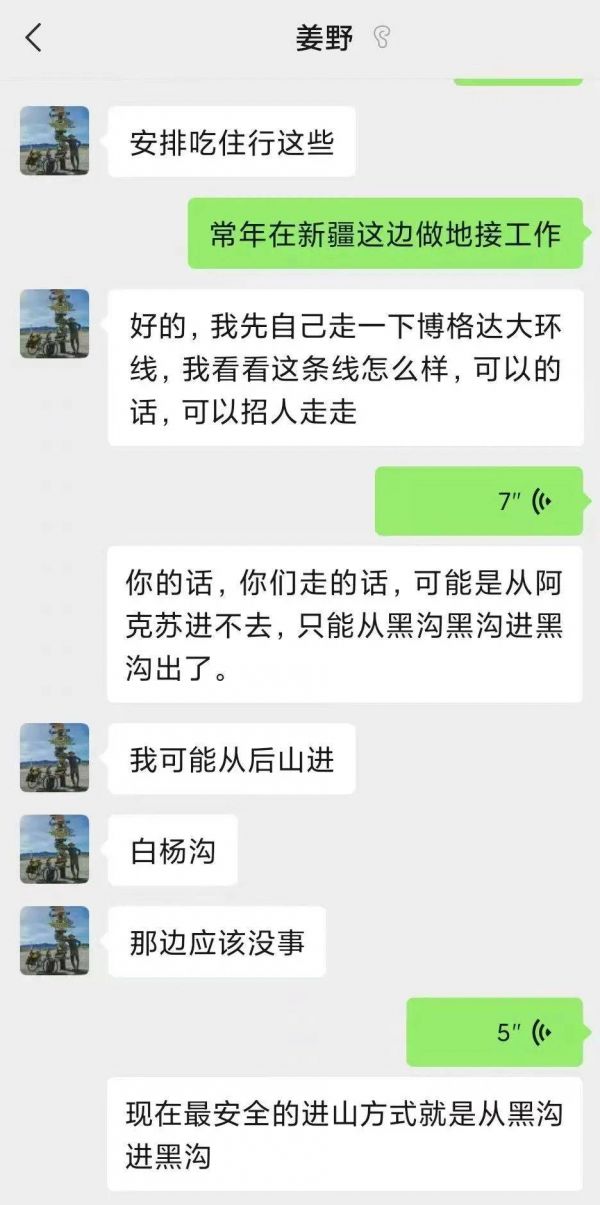 6月下旬,姜野与搭档计划前往博格达环线,并开始咨询多个户外徒步团领队这一路线的情况,需要做什么准备等。