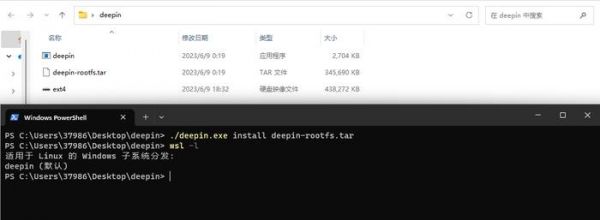 将下载的 deepin.zip进行解压缩,在解压的文件夹打开终端。运行命令:./deepin.exe install deepin-rootfs.tar 等待安装完成。安装完成会出现一个 ext4 的文件。