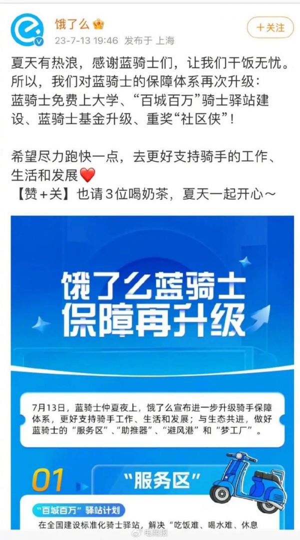 日前饿了么就宣布将蓝骑士保障再升级,推出了蓝骑士免费上大学、“百城百万”骑士驿站建设、蓝骑士基金升级、重奖“社区侠”,四大举措支持骑手工作、生活和发展。目前处于行业老二地位的饿了么,在骑手权益的保障层面走到前列,为其他企业起到示范作用。从商业角度考虑,这将为饿了么吸引更多骑手,进一步提升其配送服务质量,并反馈到消费者体验过程中,形成正向循环。