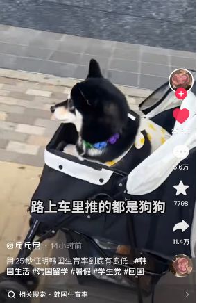 一位在韩国留学的短视频博主,回国前想给侄子买点礼物,在附近找不到一家母婴店。无论是书店、玩具店还是公园里都没有出现孩子的身影,路边人们推的婴儿车里全是宠物狗。视频的最后,这位博主感叹,“韩国是真的没人生小孩了”。