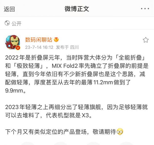 折叠屏发展趋势是什么?去年小米MIX Fold2已经已经指明了方向。但轻薄只是基础,还要做到旗舰配置。不能在体验上缩水,无线充电、拍照等都是至关重要的。一句话:折叠屏做轻薄不能牺牲体验,尤其不能牺牲影像,接下来看小米、OPPO、三星怎么出牌了。