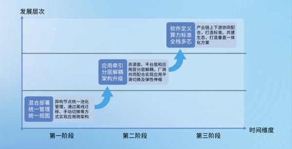 亓开元介绍说,第一阶段的核心在于解决“有”的问题,以云为入口,通过云操作系统实现异构处理器的统一管理;第二阶段解决“好”的问题,进一步实现应用的低成本跨架构切换。通过资源层、平台层和应用层的“分层解耦”设计,实现架构升级;第三阶段是解决“优”的问题,共同推动应用与云基础设施的一云多芯相结合,打造垂直一体化方案,实现应用层面的跨架构无感知切换。在标准和测评方面,联合专业软件测评机构及产业链上下游生态,形成一云多芯行业标准。