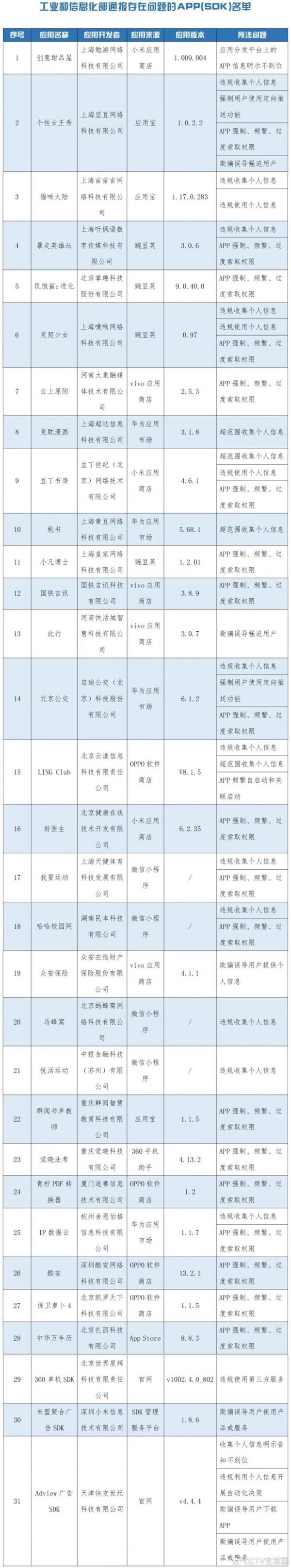 7月7日,工业和信息化部通报了31款存在侵害用户权益行为的App(SDK),内容如下: