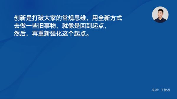 所以说,创新是打破大家的常规思维,用全新方式去做一些旧事物,就像是回到起点,然后再重新强化这个起点。