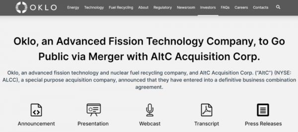 投资界-天天IPO获悉,本周,知名核裂变创业公司Oklo Inc.在官网宣布,已与特殊目的收购公司AltC Acquisition Corp.达成最终的业务合并协议,将以SPAC方式上市。