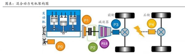 以发动机为起始端,距离最近的是 P( P = Position)0 电机,它是 48V 轻混车型实现动力混合的关键部件,输出功率小,加装成本低,实际功效基本上可以忽略不计。