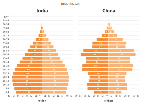 中国和印度的人口金字塔对比,每个金字塔中左边是男性,右边是女性
