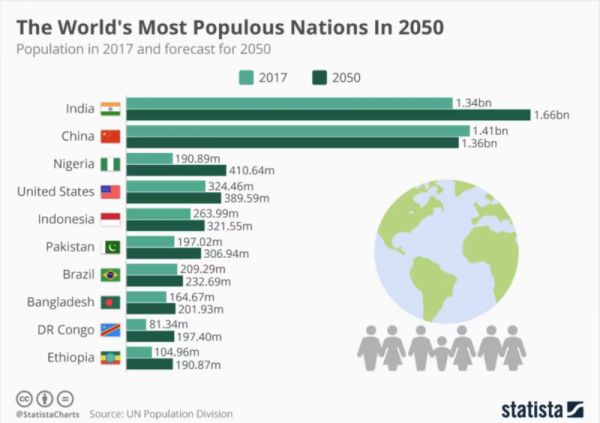2050年人口最多的十个国家,印度第一,中国第二,尼日利亚第三,美国第四