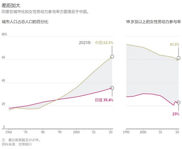中国和印度城市化和女性劳动力参与率对比