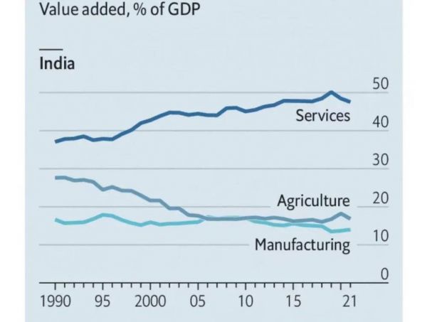 印度经济中各产业占比:服务业最多,其次是农业,最后才是制造业