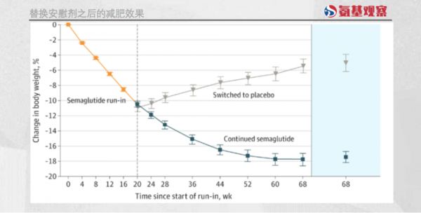 在Semaglutide的STEP 4戒断试验中,其中接受Semaglutide20周的参与者,在第48周反弹了三分之二,尽管他们接受了持续的生活方式干预。