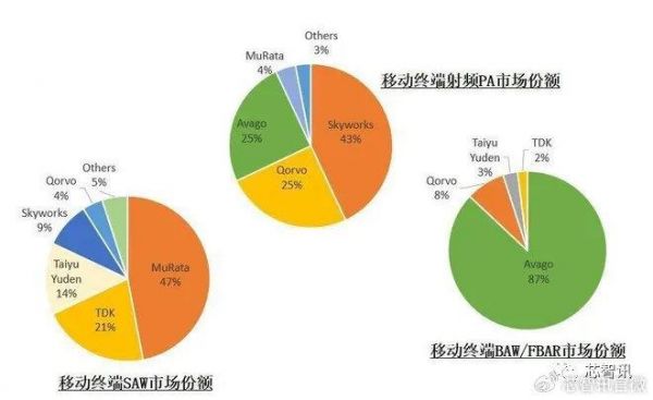 根据Yelo数据显示,在移动市场,现在全球93%的PA供应集中在 Skyworks、Qorvo 和 Broadcomm(Avago)等头部几家厂商手中。滤波器也被Murata、TDK、TAIYO YUDEN、Broadcomm(Avago)和Qorvo等厂商瓜分,其中Murata、TDK和TAIYO YUDEN瓜分了82%的SAW滤波器(声表面波滤波器)市场,而Broadcomm(Avago)和Qorvo则占据了95%的BAW滤波器(带谐振腔体声波滤波器,包括BAWSMR和FBAR)市场。