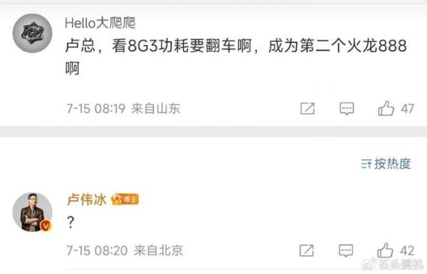 就曝光的性能跑分来看,骁龙8 Gen3的性能提升属实是不小,但因此有网友担心该芯片会不会功耗、发热大,于是就有网友询问了卢伟冰,结果钓鱼失败,卢伟冰只回复了一个问号。当然了,卢伟冰这个问号还有一层意思,就是疑问骁龙8 Gen3功耗翻车从何而来?而反过来的意思就是功耗没有翻车。