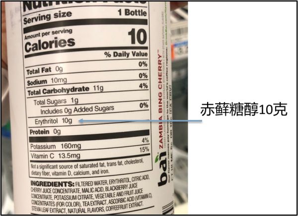 赤藓糖醇自己也是代糖界新星。国内某品牌的风靡让赤藓糖醇名声大振。美国这里也有网红饮料用赤藓糖醇,例如Bai,不仅用了赤藓糖醇还有Stevia: