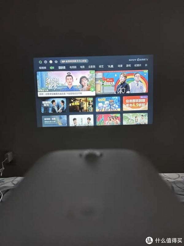 这就挺尴尬,我的小房子,最珍贵的面积都给客厅65英寸大电视了,房间里下了床就碰到了墙,没有小茶几。家里再找不到整面的的大白墙了,只能把机器加高放在床上。这得想个办法固定在墙上,不然翻个身,跟看枪版一样。