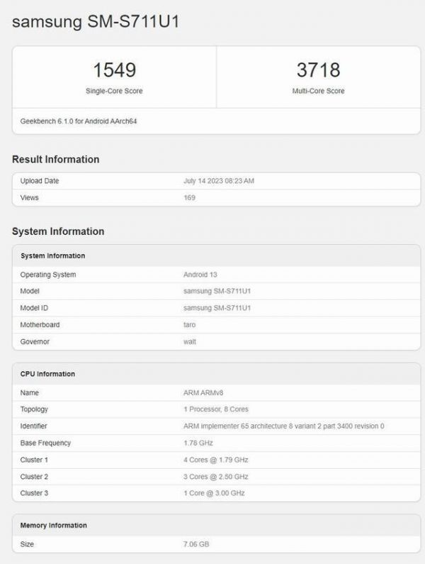 近日,美版三星Galaxy S23 FE手机在GeekBench跑分库中曝光,型号为SM-S711 U1。最引人注目的是该机采用高通骁龙8 Gen 1处理器,表明该手机将提供骁龙和Exynos 2200两种处理器版本。