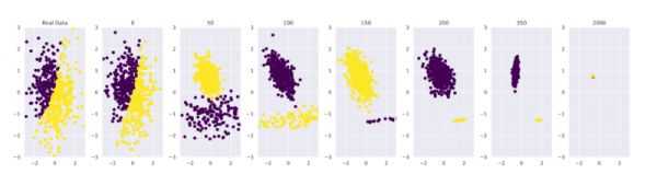 可以看到,模型一开始对数据的拟合非常好。到第 50 次迭代时,基础数据分布开始被错误感知。当迭代来到 2000 次时,模型已经收敛到一个很小的点,这意味着模型开始稳定输出错误答案。