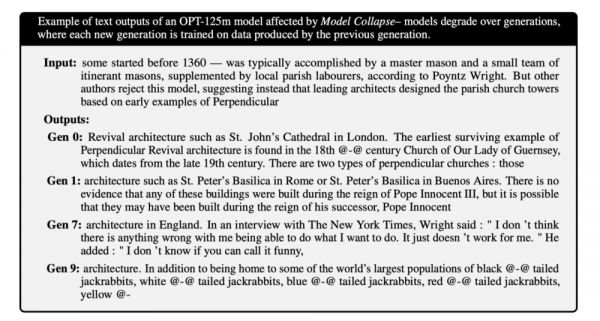 前一代模型生成的数据,会污染下一代模型,经历几代模型的“传承”,它们就会错误地感知世界。
