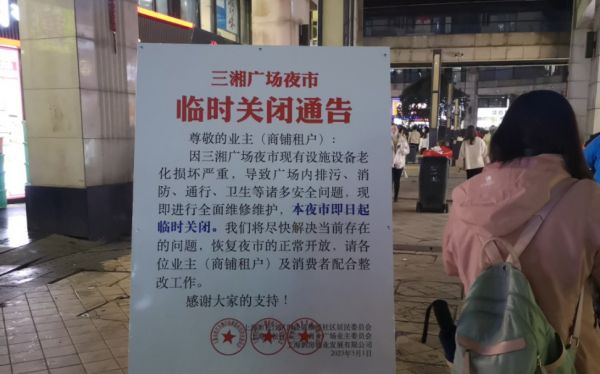 今年3月,三湘广场发布临时关闭公告:由于广场内设施设备老化损坏严重,存在排污、消防、通行、卫生等诸多安全问题,夜市关闭进行全面维修。