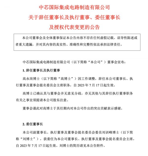 7月17日,中芯国际(688981.SH)发布公告称,高永岗博士(以下简称“高博士”)因工作调整,辞任本公司董事长、执行董事及董事会提名委员会主席职务,自2023年7月17日起生效。