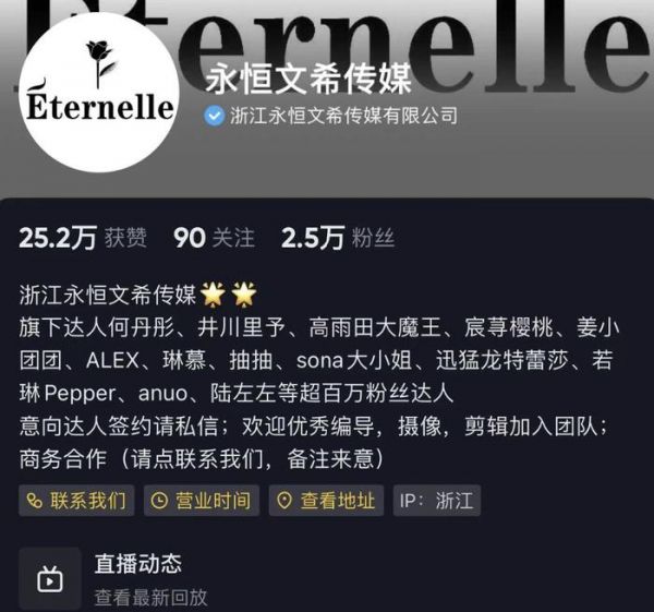 谁火就签谁,永恒文希在签约达人方面,俨然一副财大气粗的架势。除了井川里予,永恒文希在今年5月还签下了号称“抖音第一美”的女网红@迅猛龙特蕾莎。两个月内,迅速签下两位千万级网红,永恒文希正在打造一支网红界的“银河护卫队”。目前,永恒文希旗下的网红阵容:何丹彤(1534万)、井川里予(2007万)、高雨田大魔王(3018万)、宸荨樱桃(1557万)、姜小团团(895万)、Sona大小姐(469万)、迅猛龙特蕾莎(617万)等众多千万级粉丝达人。