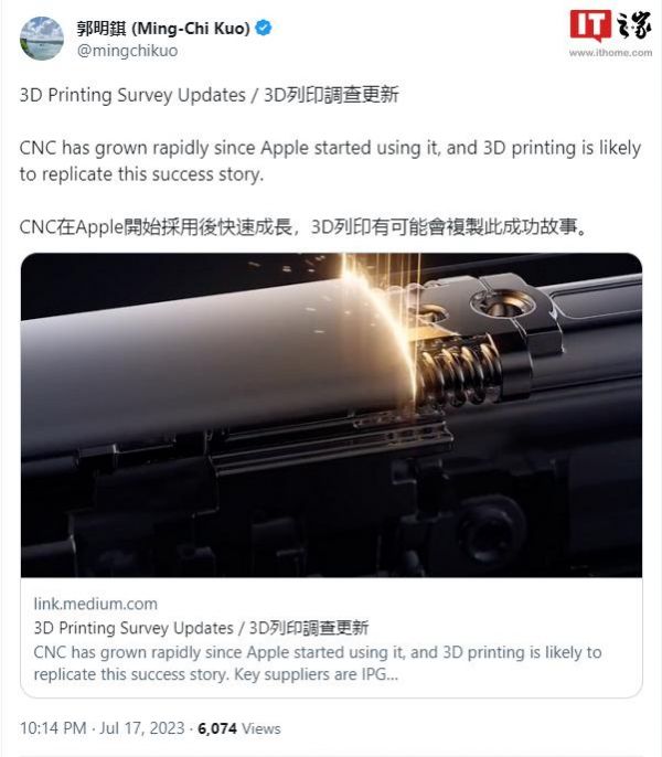 IT之家 7 月 17 日消息,跟踪苹果产业链多年的分析师郭明錤今日发布报告指出,CNC(数控机床)在苹果开始采用后快速成长,3D 打印有可能会复制此成功故事。关键供应商为激光零部件的 IPG Photonics,以及 3D 打印机供应商的华曙高科与铂力特。