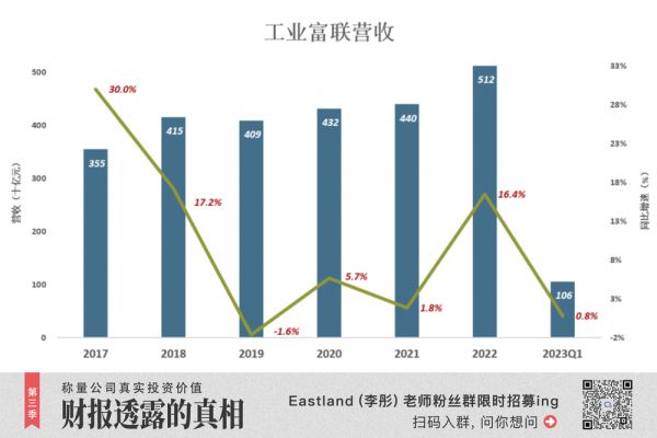 2023年Q1,工业富联营收1059亿,增速回落到0.8%;