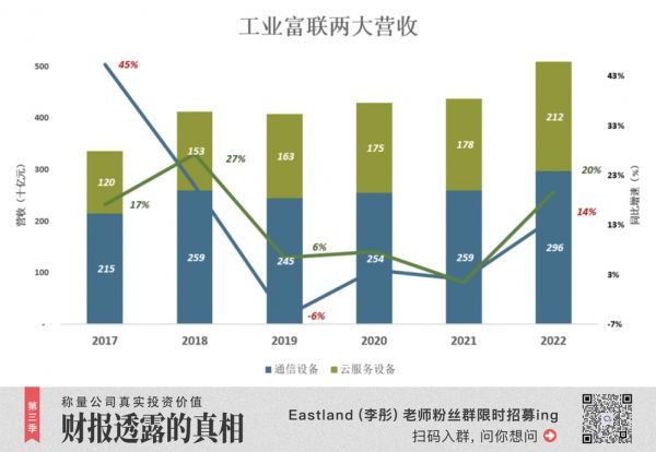 2022年,通信设备、云服务设备销售收入合计占营收的99.4%。2020年、2021年,这个比例分别为99.4%、99.3%。年报刻意披露的“工业互联网”业务无足轻重(2022年营收19.1亿占营收的0.37%)。