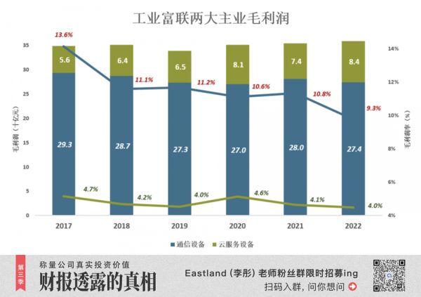 2022年,通信设备和云服务设备毛利润分别为274亿和84亿,毛利润率分别为9.3%和4%。