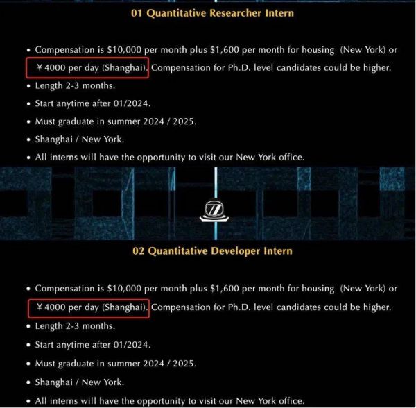 SRC在官方公号上发布了一条全球招聘显示,招聘定量研究员实习生和定量开发实习生。招聘地点为纽约和上海,其中,纽约招聘实习生薪酬为每月1万美元,外加1600美元的住房补贴;在上海的薪酬为每天4000元。此外,博士级别候选人薪酬可能会更高。