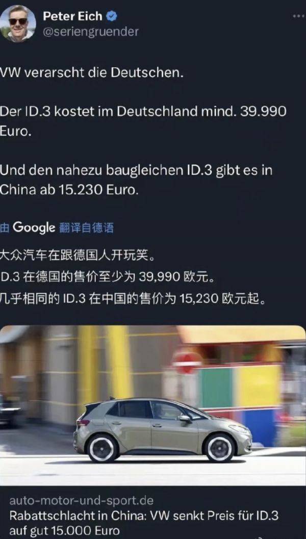最近,有德国车主在社交媒体上表达了对ID.3中欧定价差距的不满。