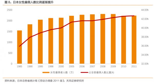 图:日本女性雇佣人数比例趋势,来源:天风证券研究所
