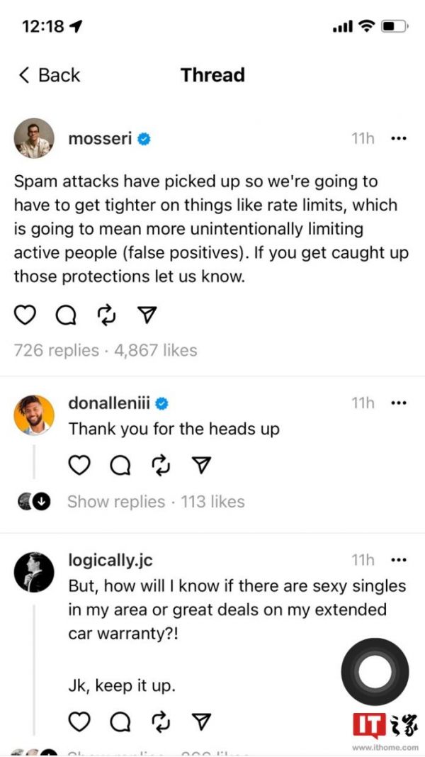 日前,Instagram 负责人 Adam Mosseri 在 Threads 上发文宣布,平台将上线“Rate limit”功能,以应对垃圾信息带来的影响。