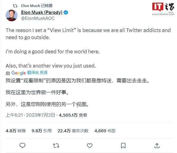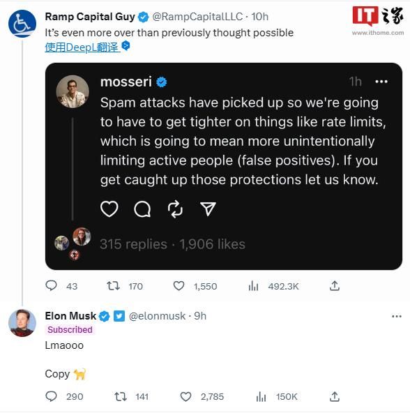 不过有消息人士指出,该举措是在步推特限流的后尘。IT之家此前报道,为了防止 AI 公司大量抓取推特数据,影响真实用户的体验,马斯克决定对推特阅读量进行限制。