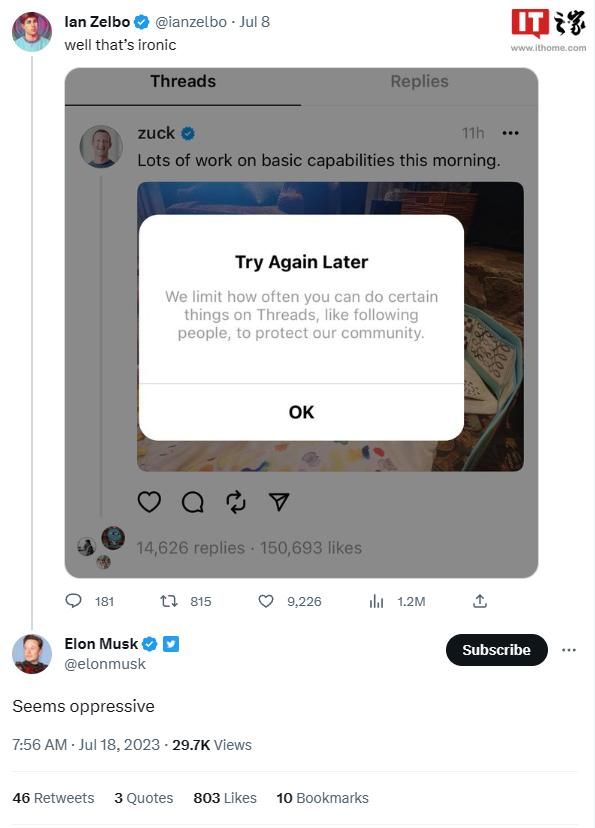 晚些时候,有 Threads 用户在推特上表示 Threads 已经采取了“限流”措施中的“限制关注他人的频次”,并称其“真是讽刺”,马斯克回复称“好像感受到了压迫”。