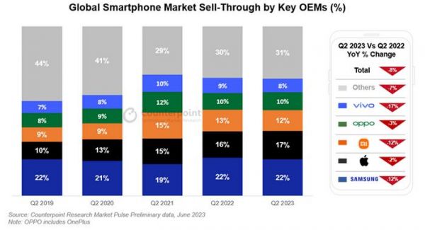 2023Q2智能手机战报:三星领衔、苹果市占17%、小米同比下降 12%