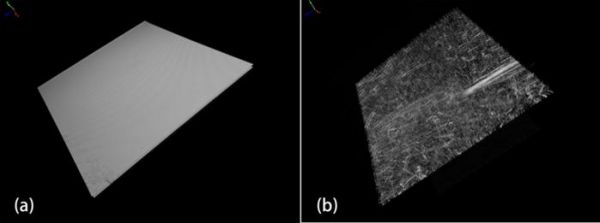 举个例子,云母片作为制造电子产品常用的绝缘材料,其平均厚度仅有52微米,使用传统方法区分上下表面以及本体之中的斑点、裂痕和花纹等缺陷非常困难。灵眸OCT可以对云母片做清晰的3D明场成像,上下表面分层明显,可在上表面看到划痕和花纹缺陷。