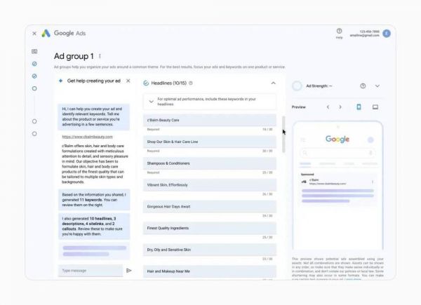 互联网广告很多时候广告的落地页都是一个网页,在谷歌的这次演示中,广告主只需要填写广告落地页的地址,大模型就可以瞬间读取网页内容,并根据网页内容生成不同的广告创意供广告主投放。