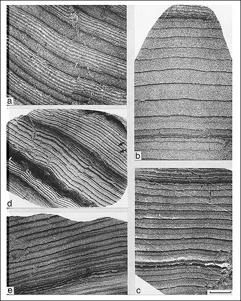 研究人员利用地质证据,比如这些来自潮汐河口的样本,揭示了春季和小潮的周期。粗带对应大潮,细带对应小潮。(图/G.E. Williams via utoronto.ca )
