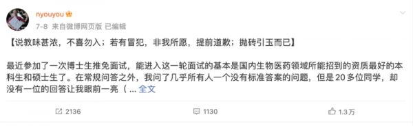近日,深圳医学科学院(筹)创始院长颜宁,在微博上分享了自己参加博士生推免面试时的经历,她问考生: