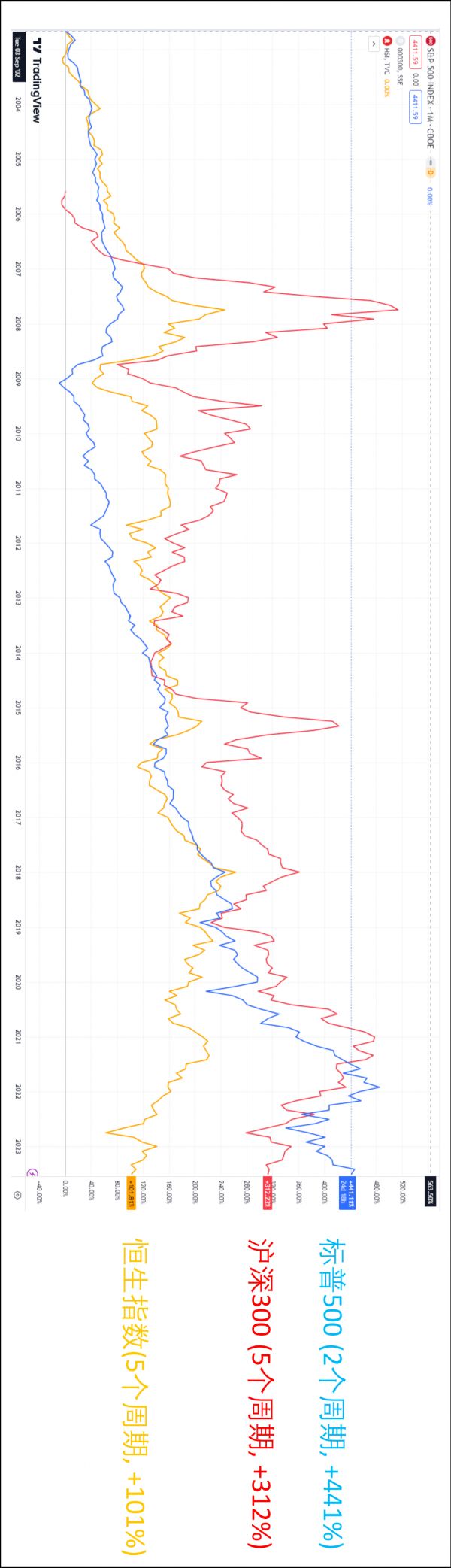 标普500(蓝线)的成长属性远大于周期属性,所以在美股环境里玩长期主义和价值投资,是匹配的。